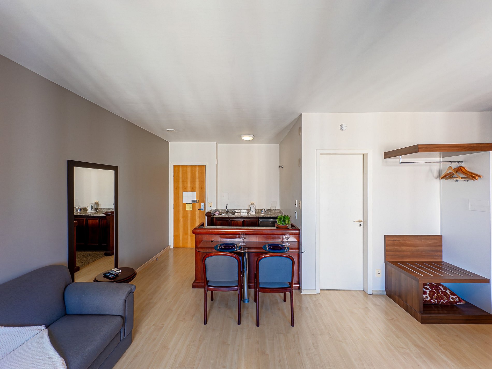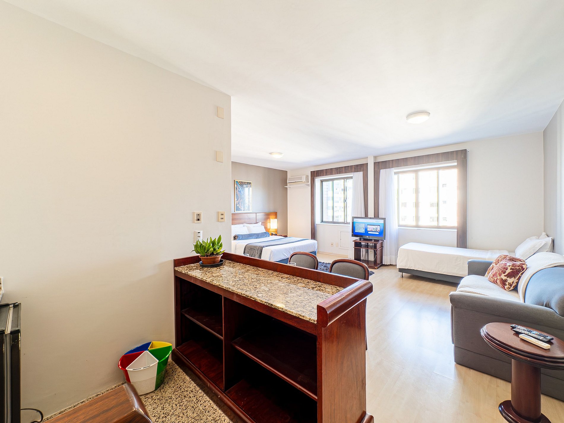 O espaço oferece quarto aconchegante, com duas camas e um sofá, cozinha equipada e Wi-Fi rápido. A localização é imbatível: você estará perto de restaurantes, mercados, lojas e dos principais pontos da cidade — perfeito para trabalho ou lazer.