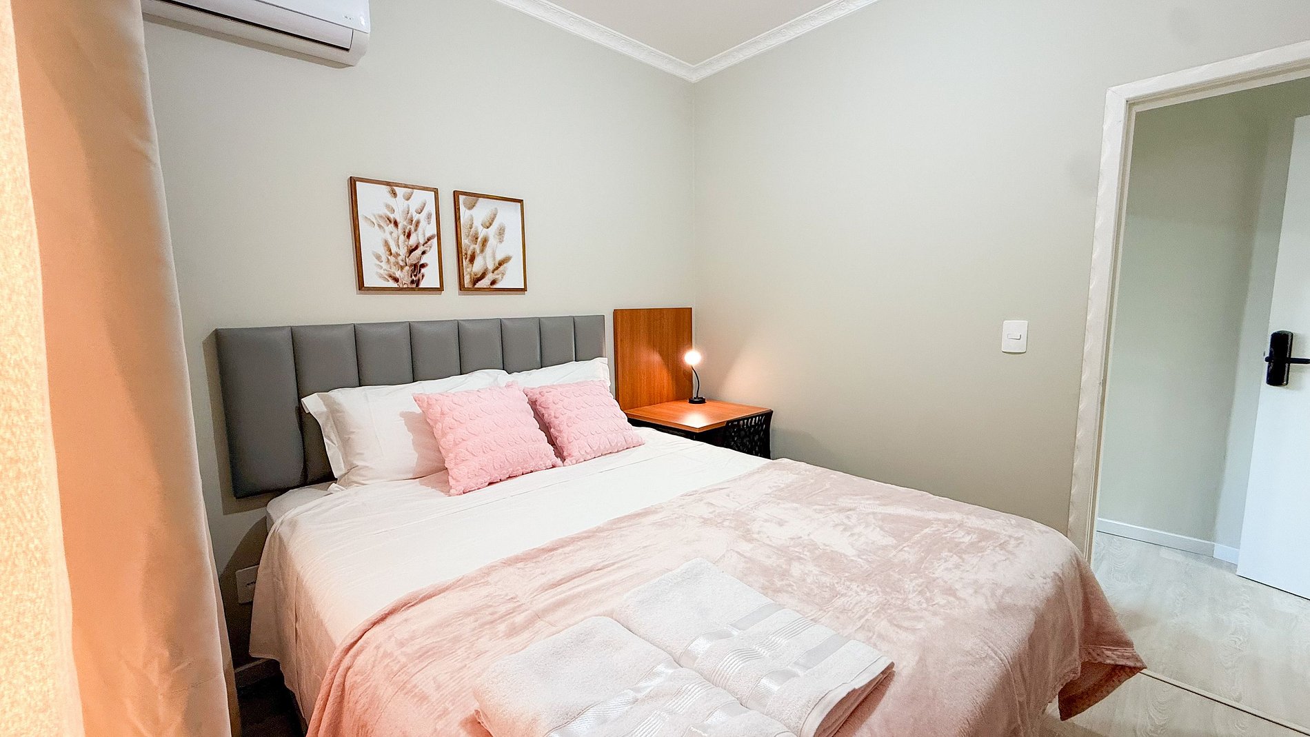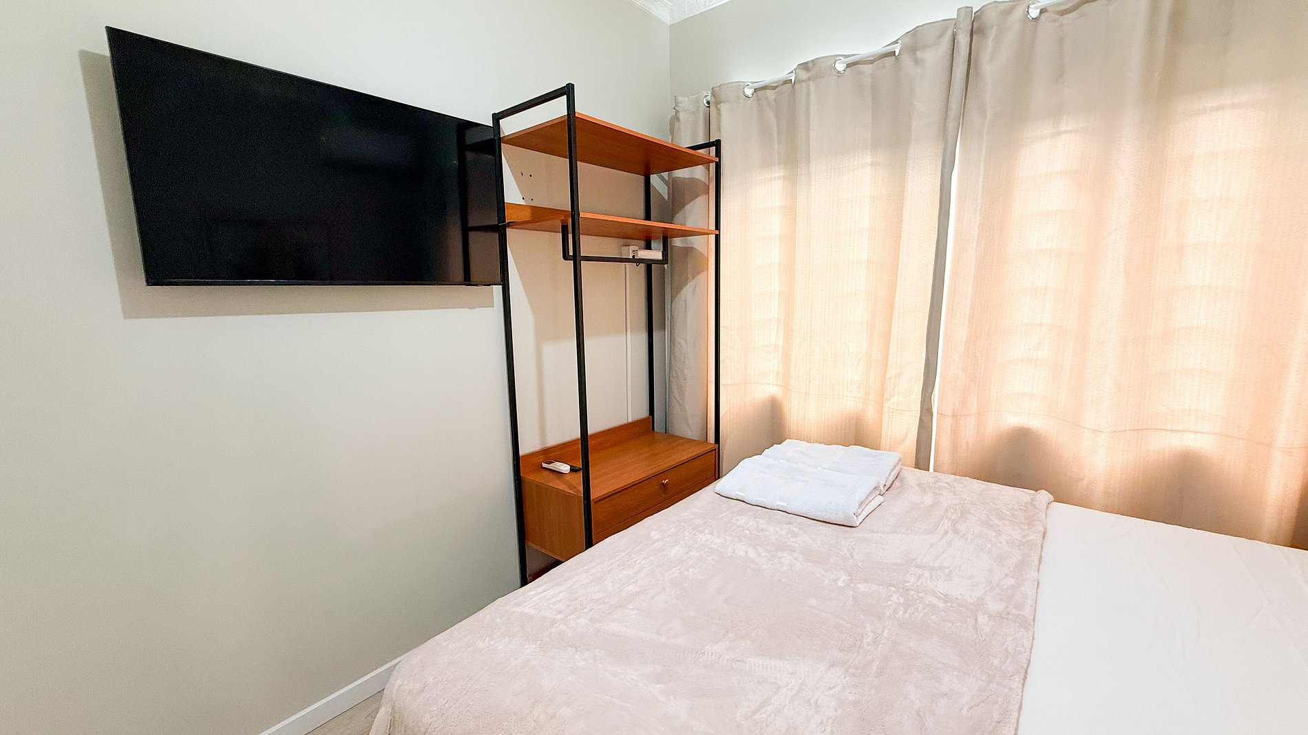 Suíte Kyoto com banheiro privativo, ar-condicionado, Smart TV Samsung, escrivaninha e fechadura eletrônica. Pousada aconchegante em Vila Nova, Joinville/SC, com áreas compartilhadas: cozinha, sala, área externa e lavanderia. Ideal para viagens a trabalho ou lazer com conforto, privacidade e praticidade