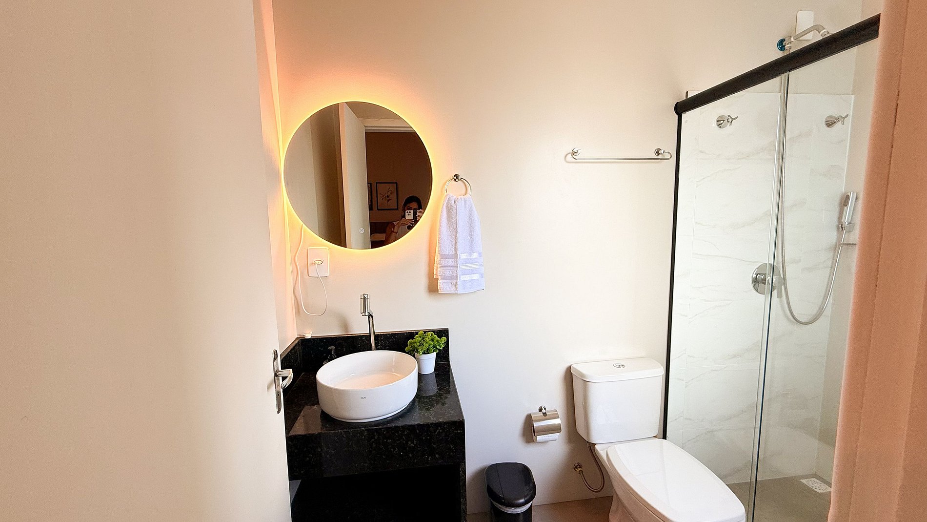 O check-in é 100% autônomo pela fechadura eletrônica. Você receberá o código de acesso antes da sua chegada e poderá entrar diretamente na sua suíte sem precisar esperar ninguém. Simples, prático e seguro.