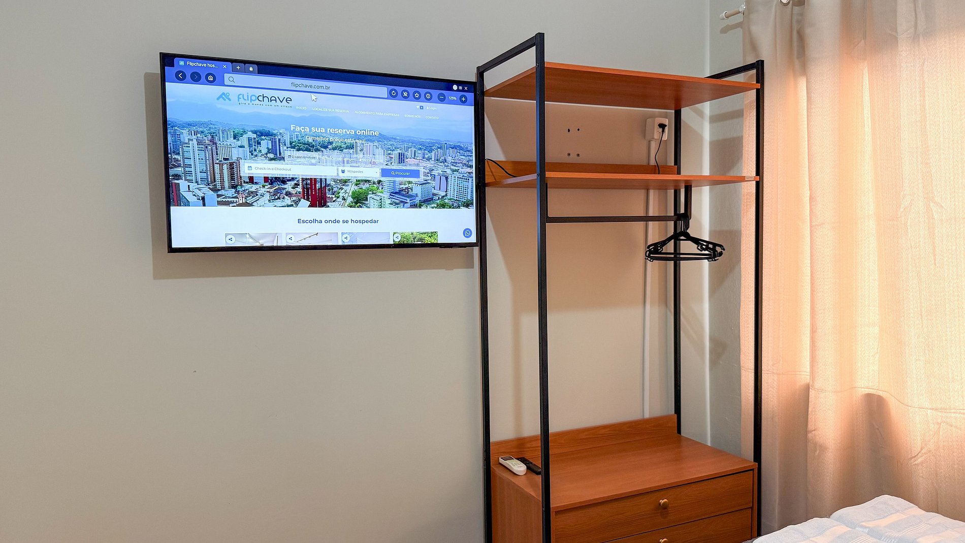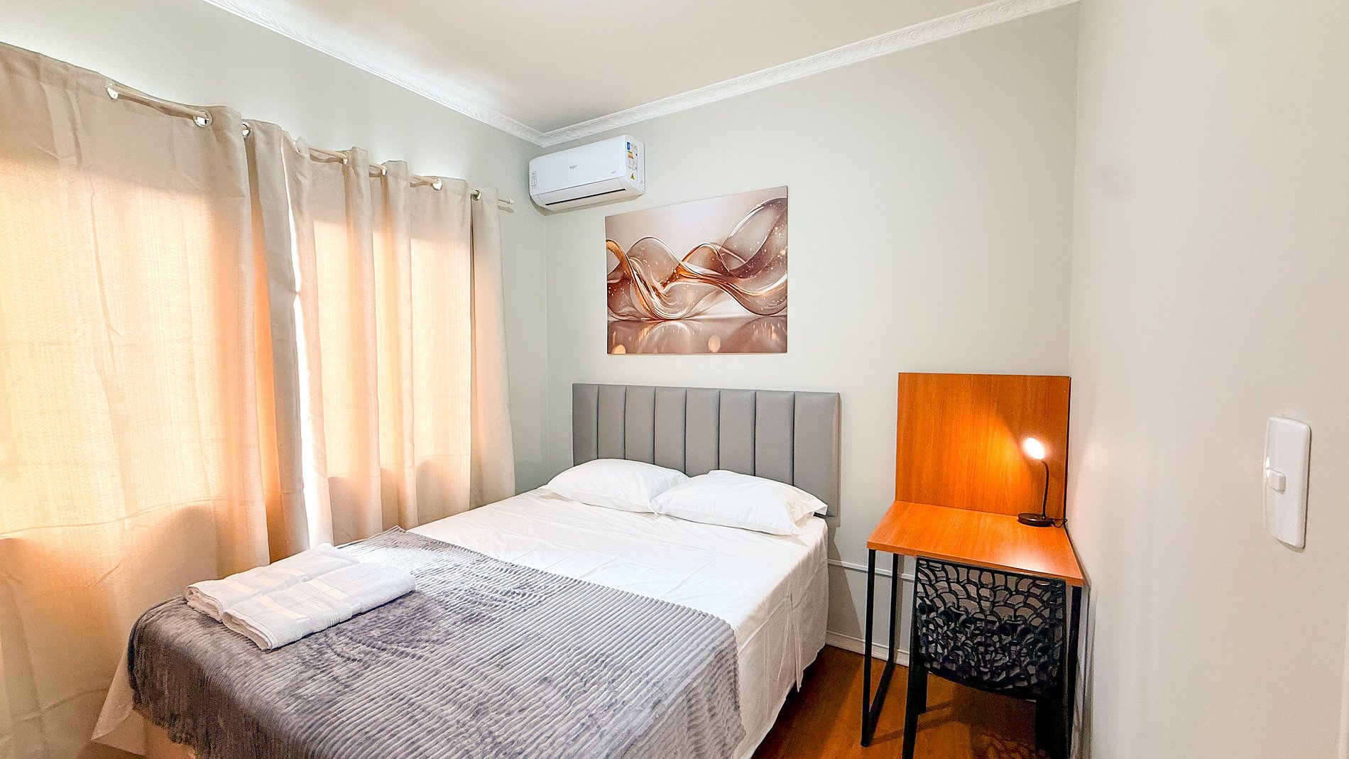 Suíte Kyoto com banheiro privativo, ar-condicionado, Smart TV Samsung, escrivaninha e fechadura eletrônica. Pousada aconchegante em Vila Nova, Joinville/SC, com áreas compartilhadas: cozinha, sala, área externa e lavanderia. Ideal para viagens a trabalho ou lazer com conforto, privacidade e praticidade