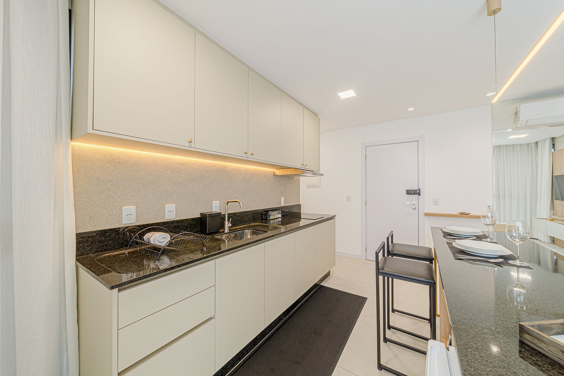O integrado conta com uma sala de estar aconchegante, área de dormir com armário embutido, cozinha compacta equipada com eletrodomésticos essenciais e um ban completo.