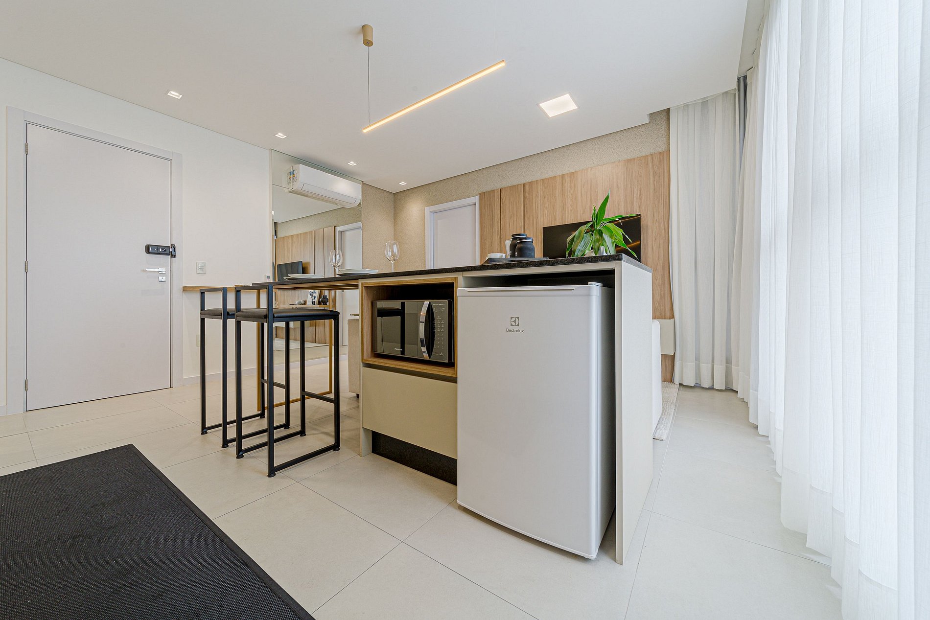 O integrado conta com uma sala de estar aconchegante, área de dormir com armário embutido, cozinha compacta equipada com eletrodomésticos essenciais e um ban completo.