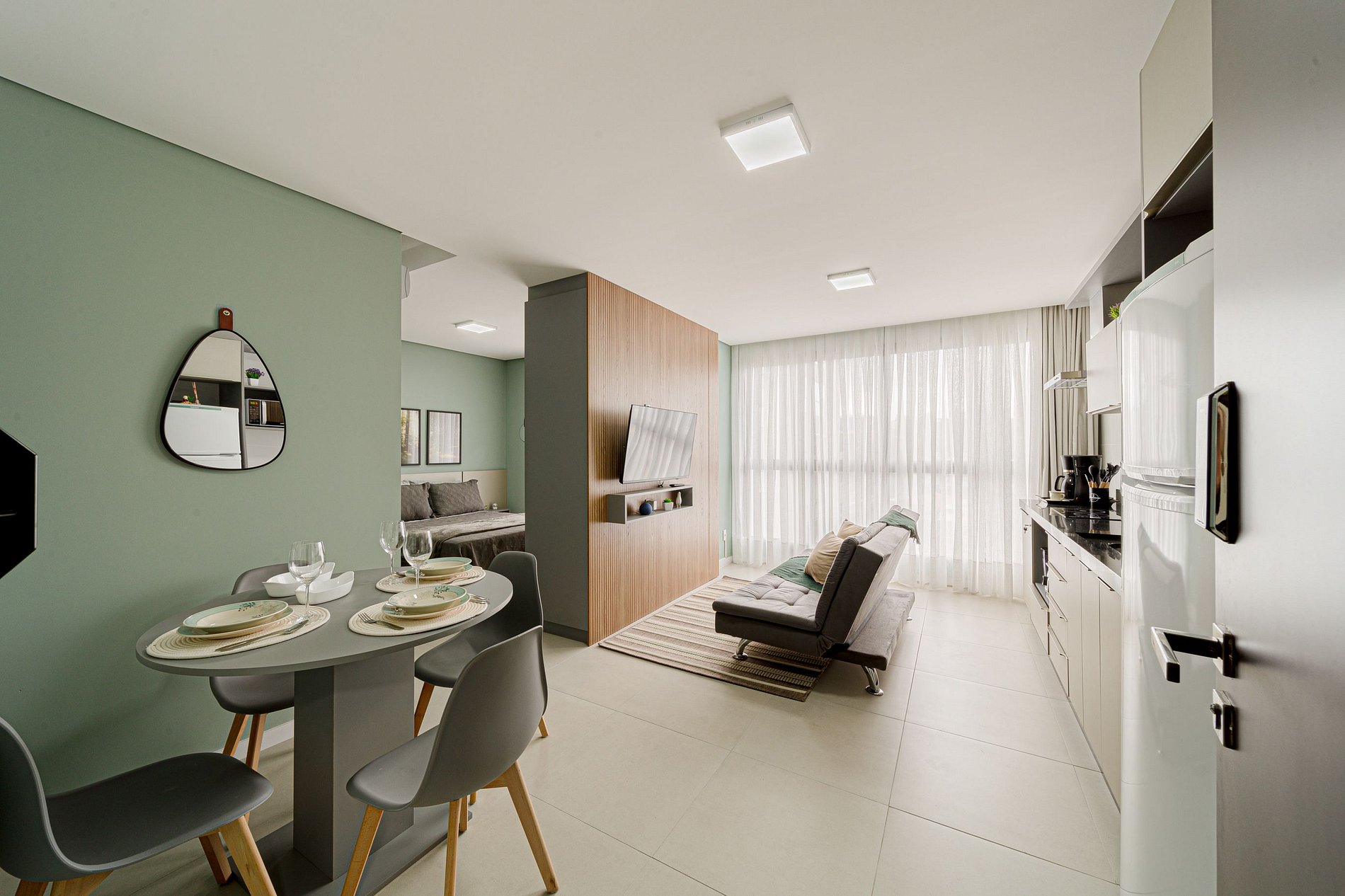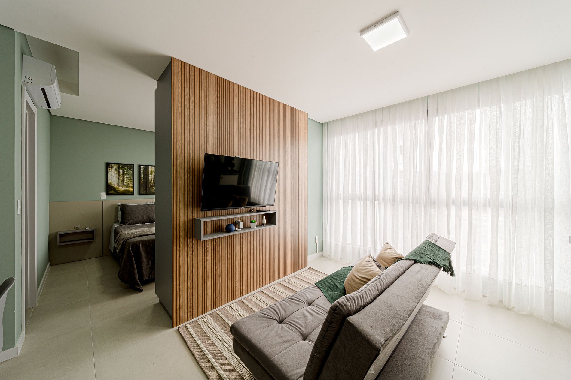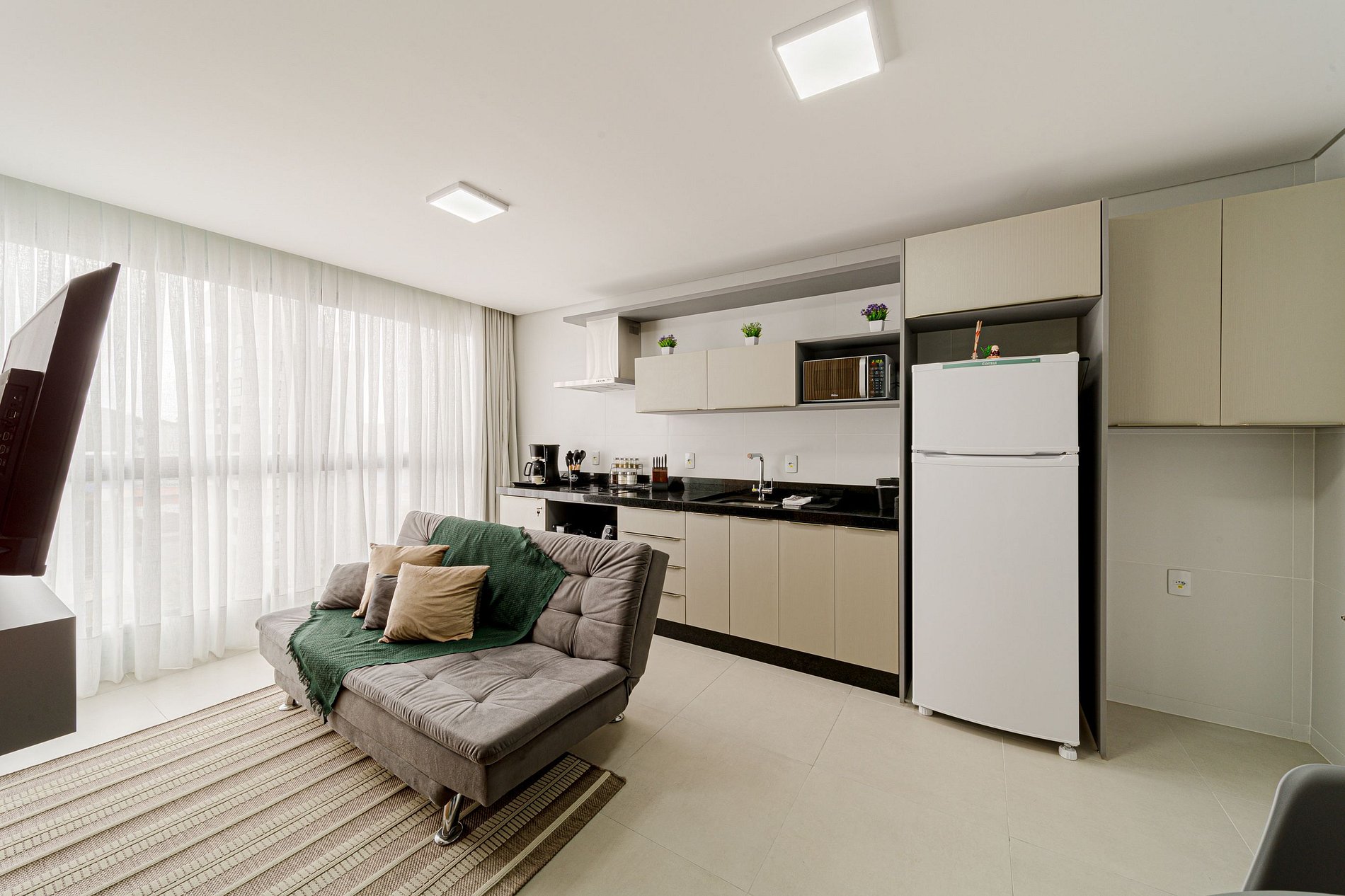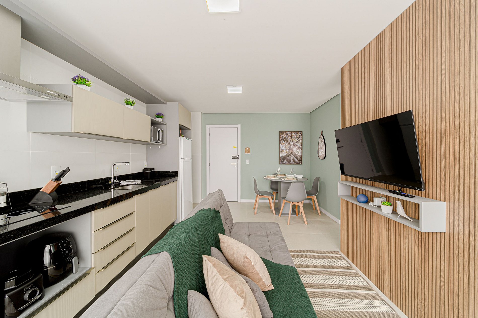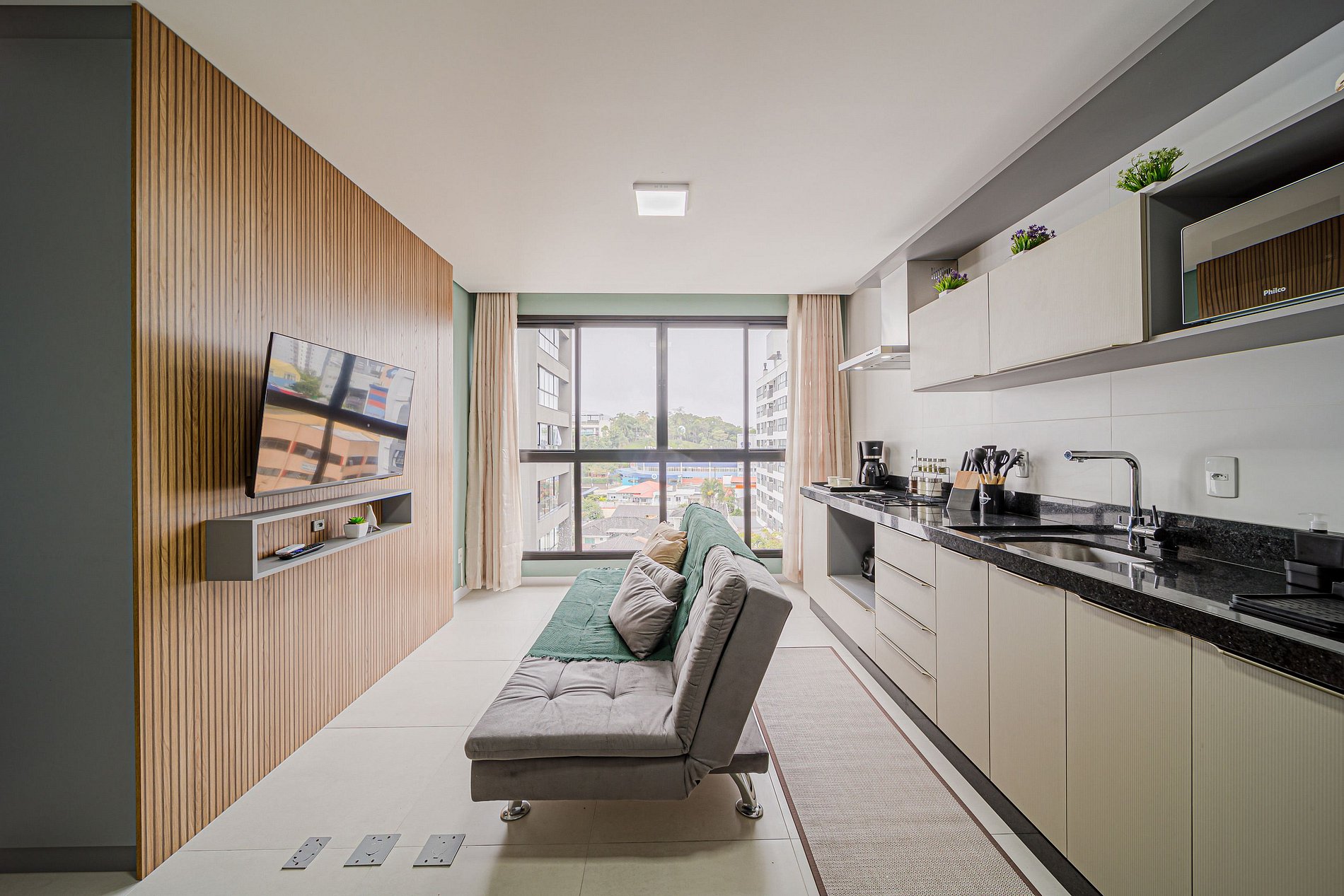 Para garantir que nossos hóspedes se sintam completamente confortáveis, oferecemos uma sala de estar acolhedora, ideal para relaxar após mais um dia. A área de dormir, equipada com um armário embutido, não apenas maximiza a organização, mas também proporciona um refúgio sereno. A cozinha é compacta, mas totalmente equipada, permitindo que os hóspedes preparem suas refeições com facilidade, criando momentos de prazer e conexão.