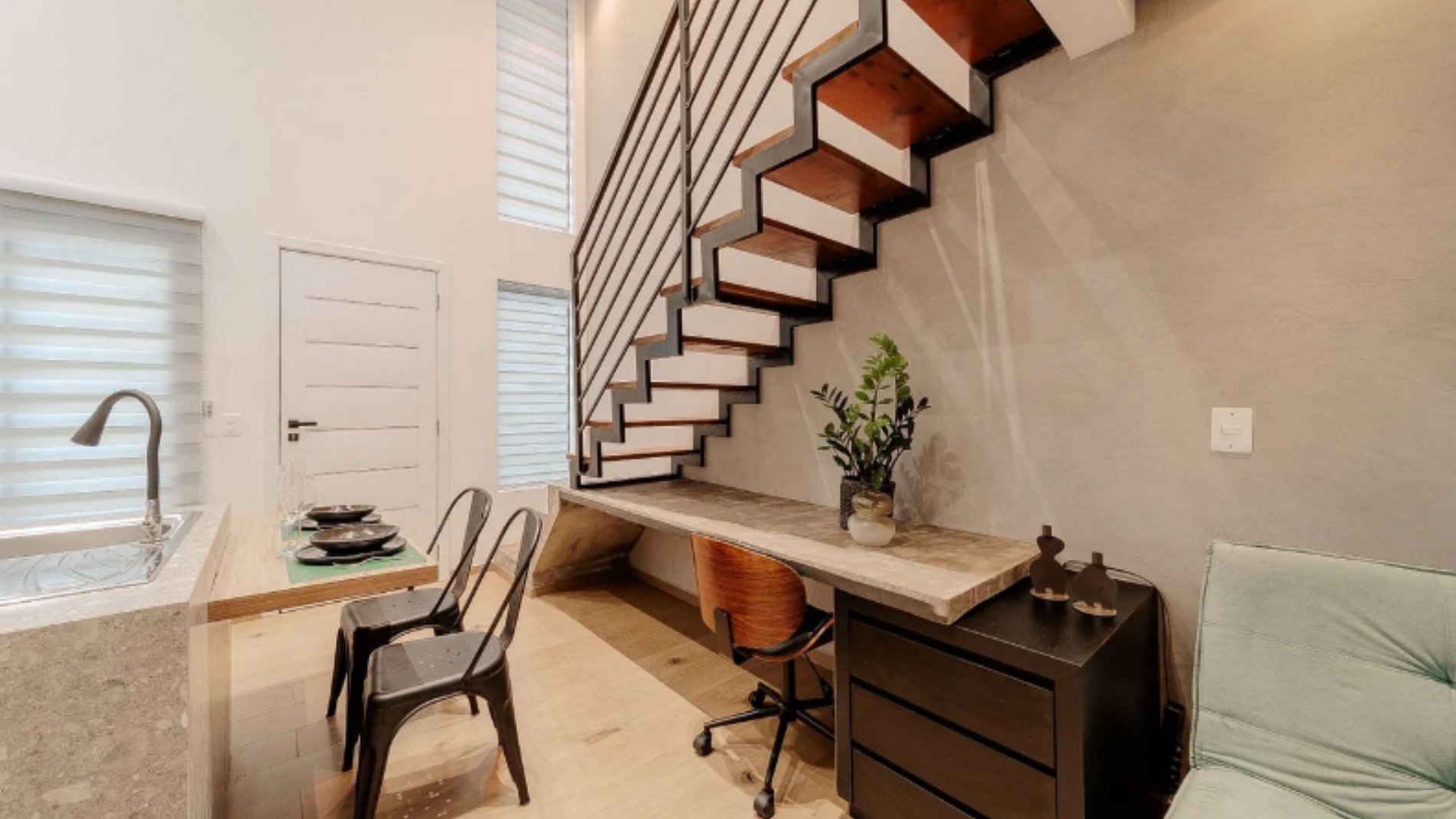 À noite, retire-se para o mezanino acolhedor, um espaço que promete noites tranquilas e reparadoras. E se você precisa de um local para trabalhar, o espaço de trabalho funcional foi cuidadosamente projetado para inspirar sua produtividade.