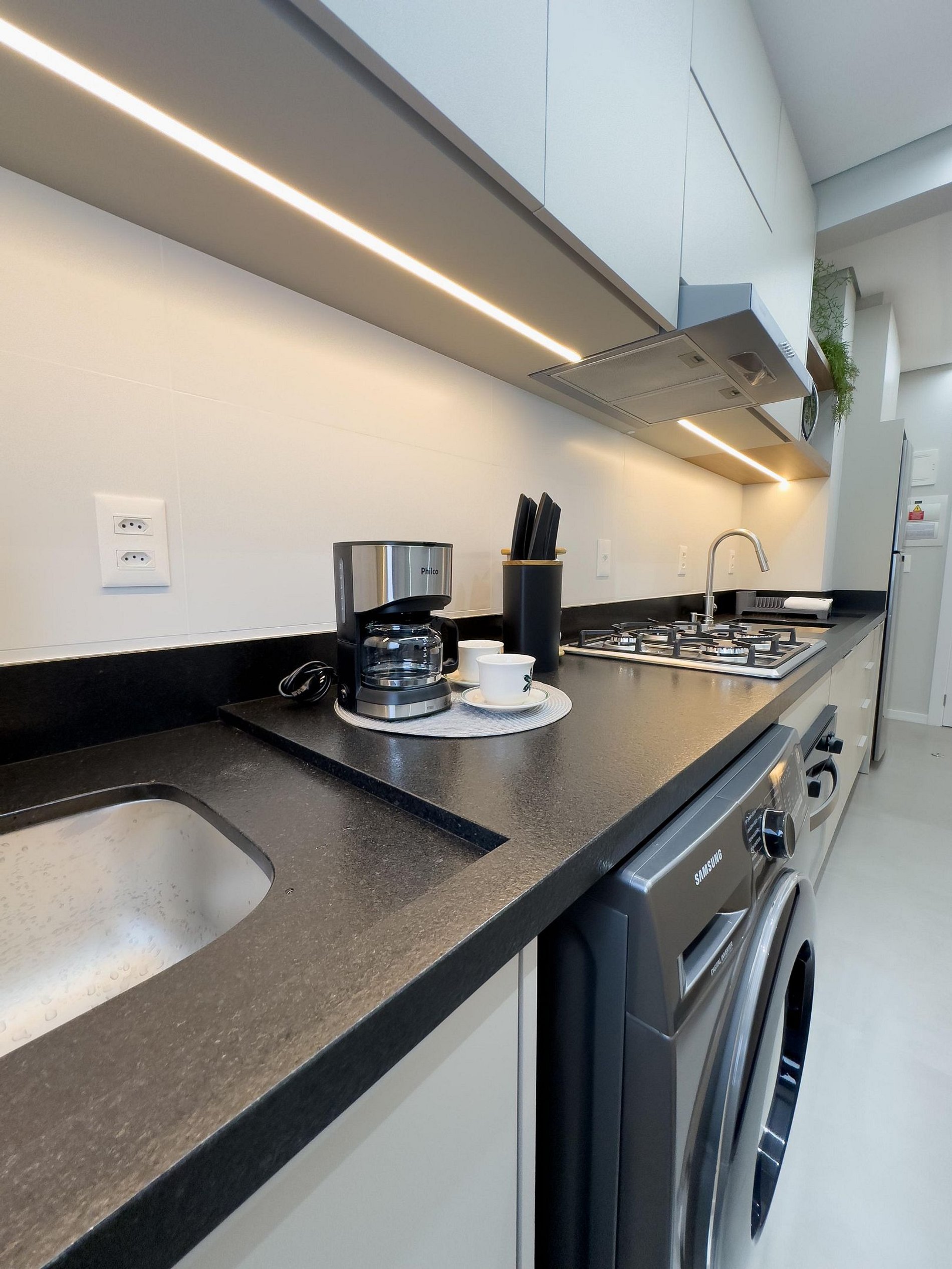 No prédio, há várias áreas de lazer, como uma excelente academia, piscina, open bar com máquina de gelo e mini mercado. Todos esses ambientes podem ser utilizados pelos hóspedes.
