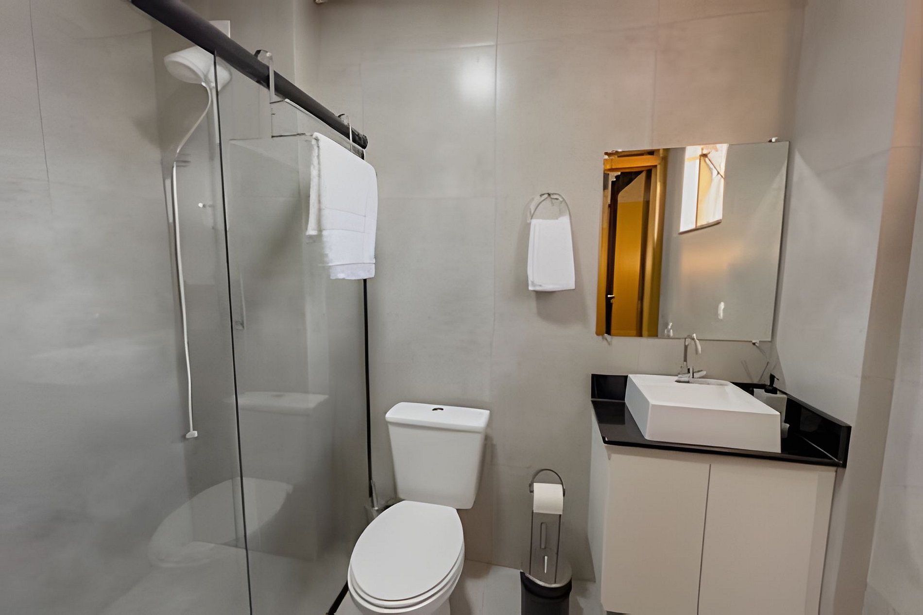 O banheiro completo, com acabamentos de alta qualidade, proporciona um toque de sofisticação que transforma a rotina diária em um ritual de cuidado. Cada detalhe foi pensado para tornar sua estadia inesquecível, garantindo conforto e lembranças especiais.